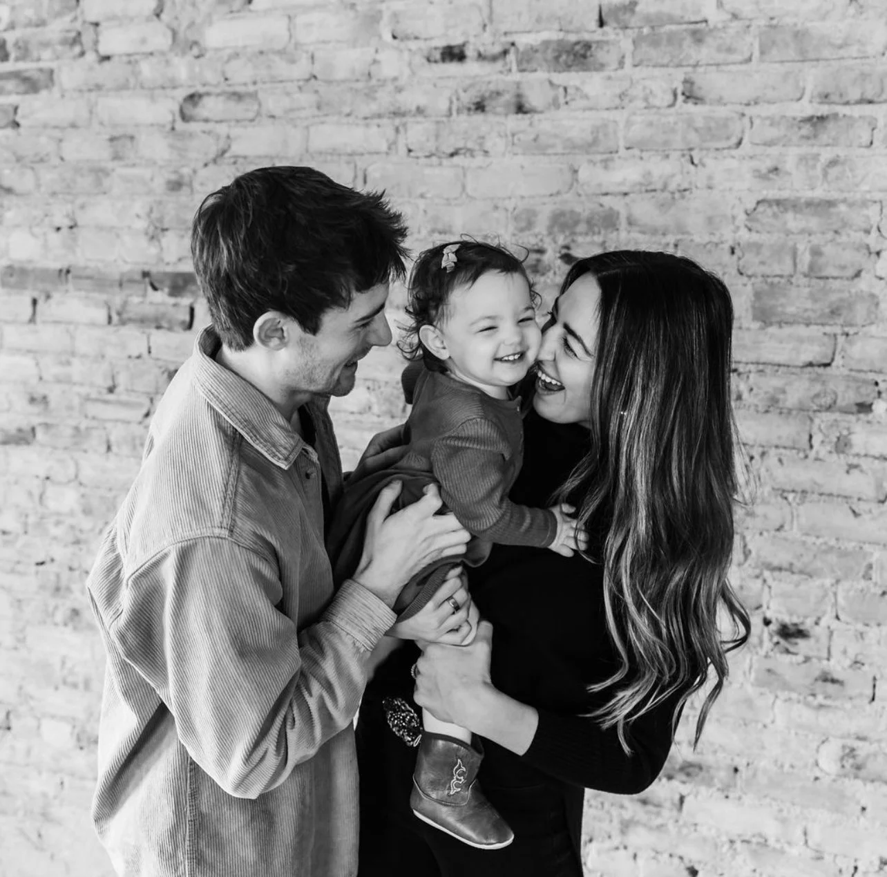 Smiling family with a man, woman, and young girl enjoying a moment together against a brick wall.