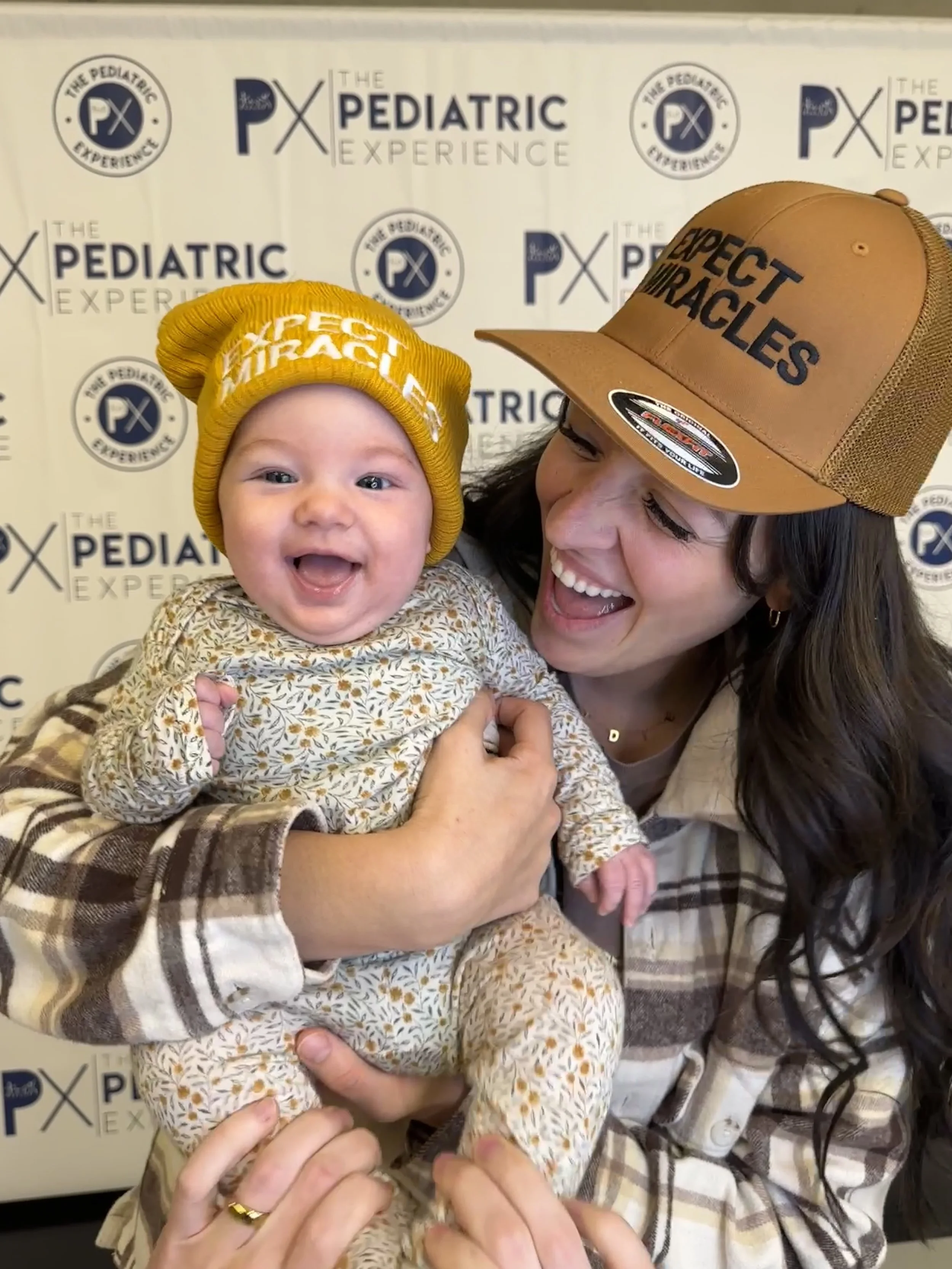 A woman and a smiling baby girl holding each other, both wearing clothing and hats with the words 'The Pediatric Experience' and 'Expect Miracles'.
